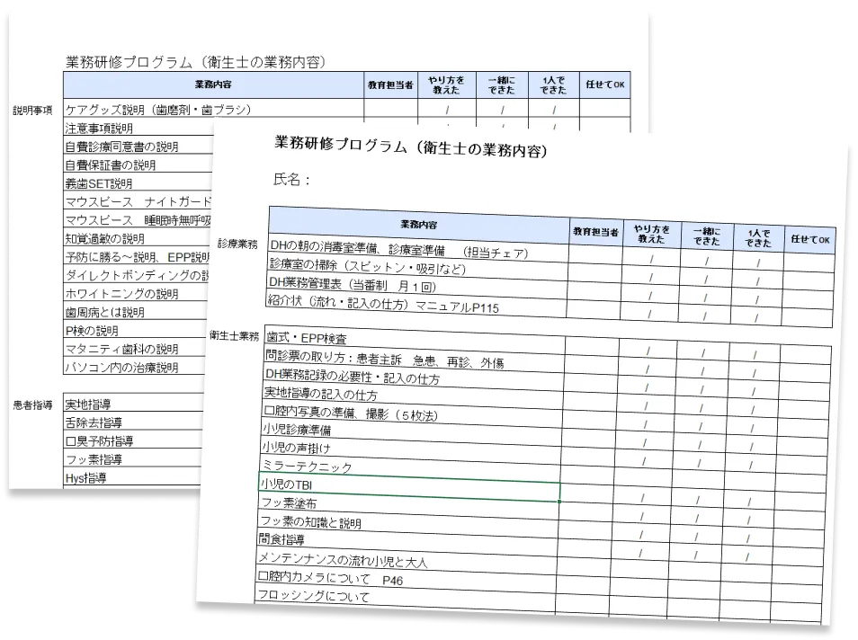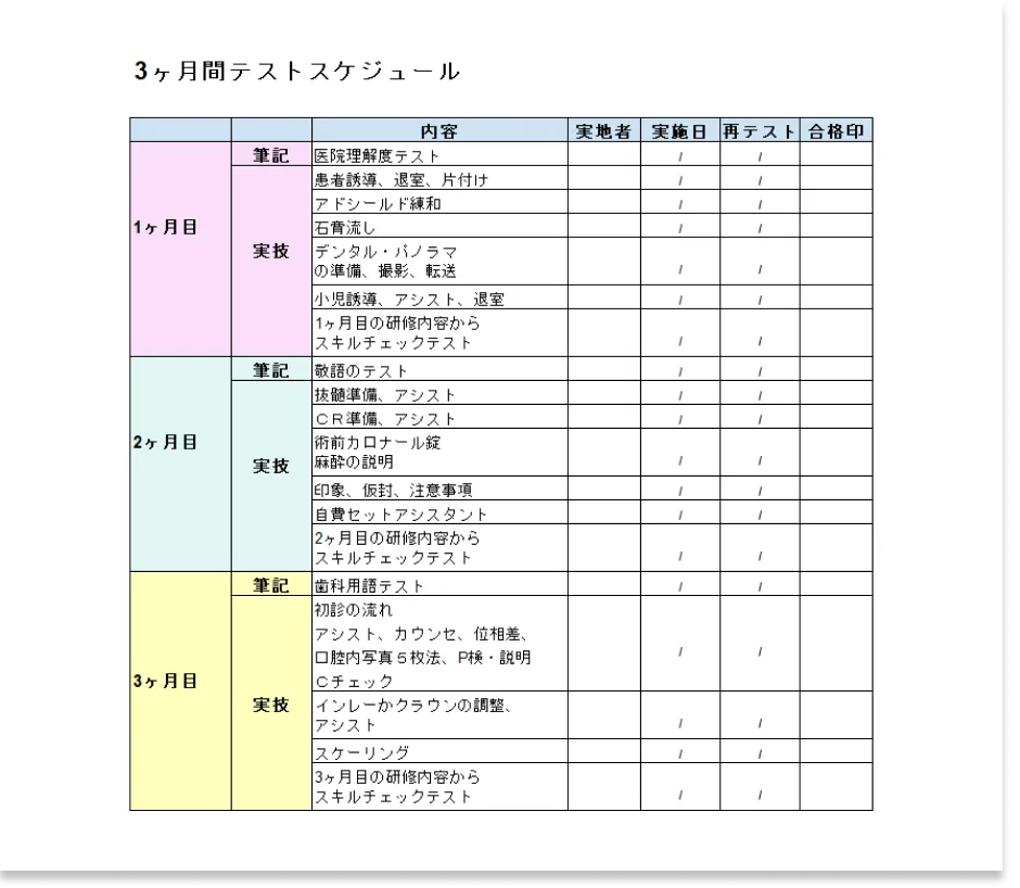 カリキュラムとマニュアルを完備しています。マニュアルは紙ベースで、お一人お一人にお渡ししていますので、いつでも確認ができます。